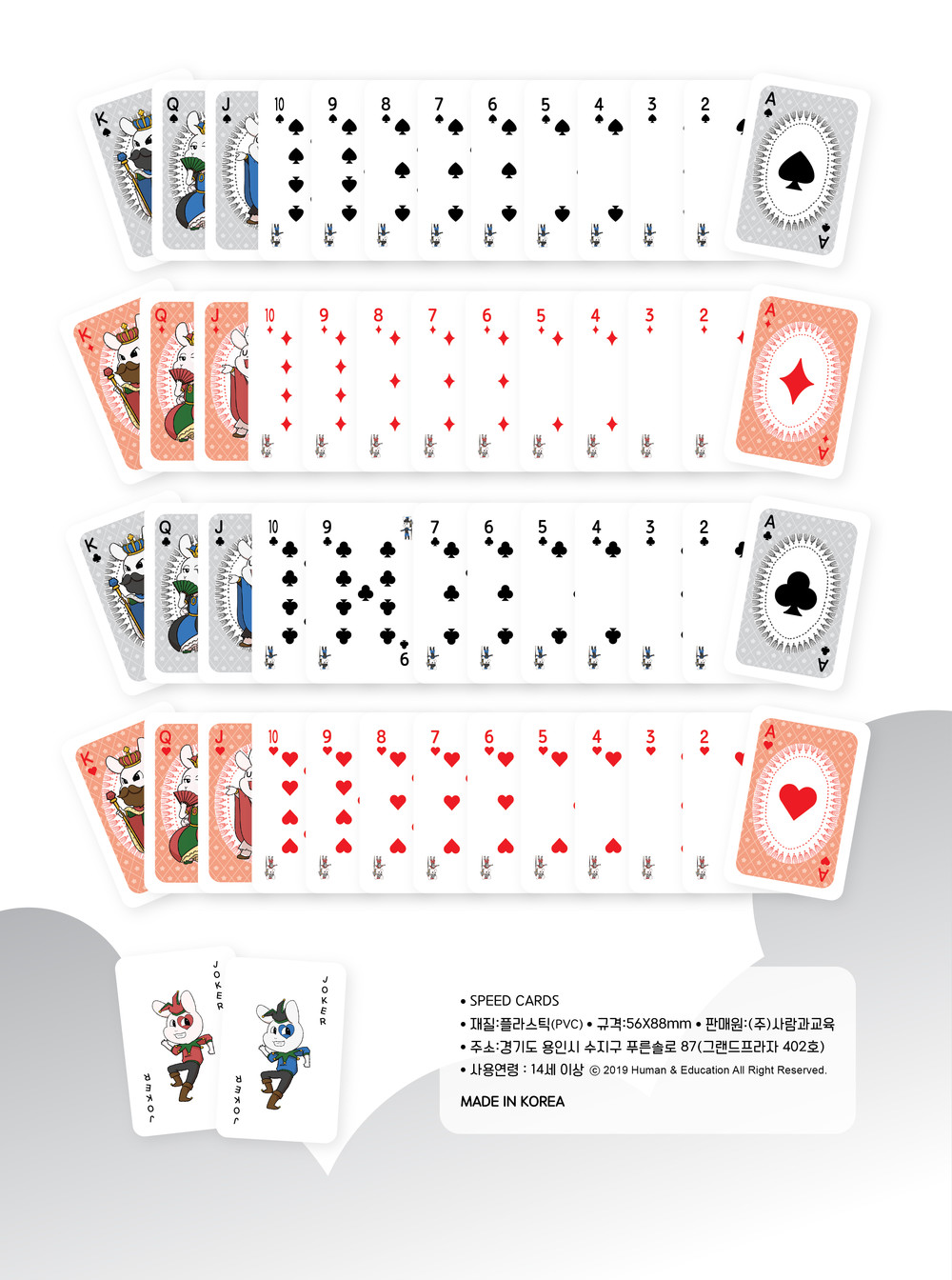 * 국제대회 규격/구성 : 52장(55장) * 캐릭터를 이용한 깔끔한 디자인 * 인체에 무해한 무독성 원단 제작 * 원산지 : 대한민국